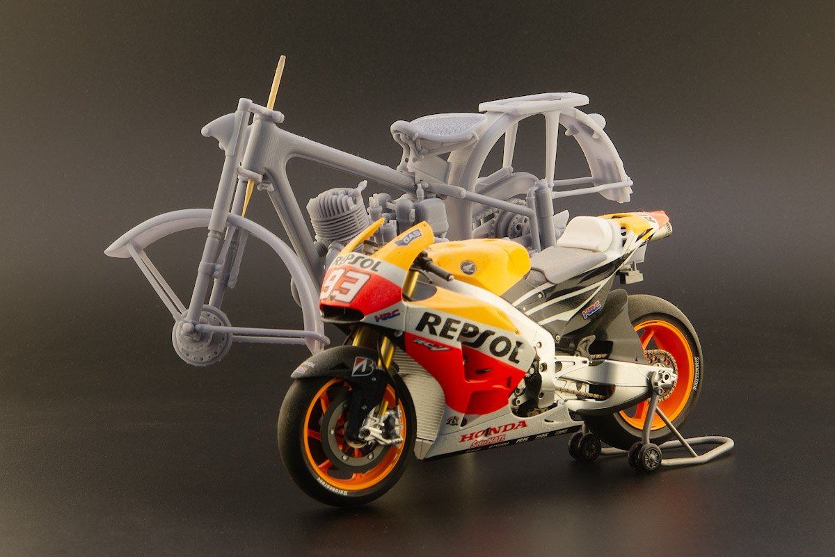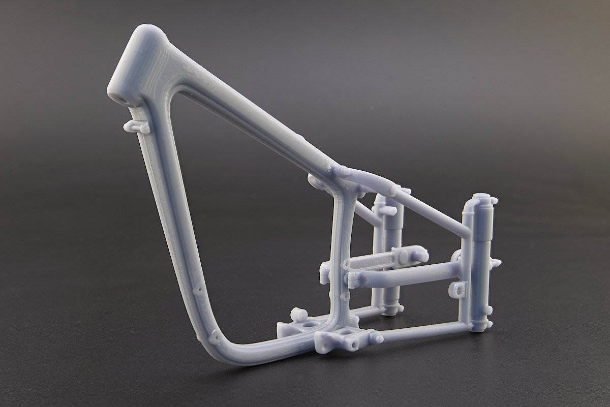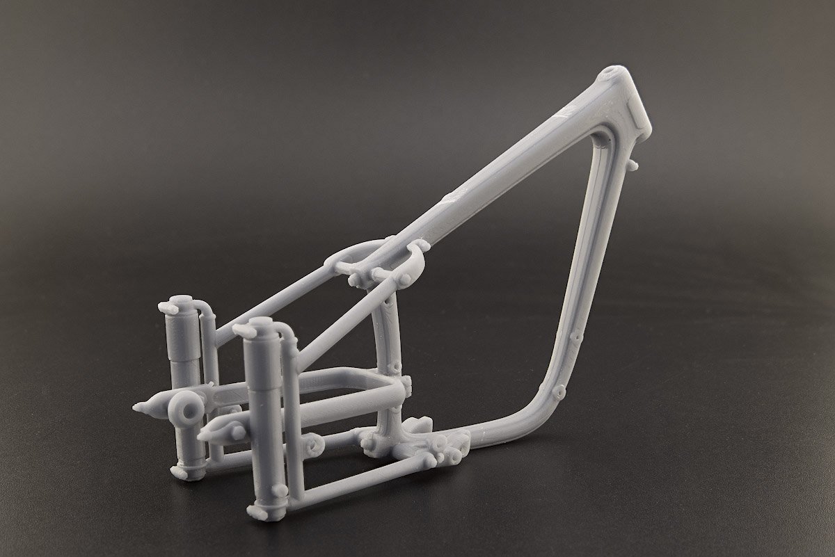 Популярный пост Николай_ 5835 Опубликовано 5 Jul 2025, 13:11:25 Автор Популярный пост Жалоба Поделиться Опубликовано 5 Jul 2025, 13:11:25 Далее по сценарию рама. Она при распаковке набора произвела наиболее удручающее впечатление своим "изкоробочным" исполнением. Вот так она выглядит: Качество печати в таком масштабе неприемлемое, плюс невозможность обработки, очистки некоторых поверхностей, находящихся на самом виду. Ну и вторая печаль — окраска. Амортизаторы вместе с крышками и крепежными болтами идут в хроме, а тут, как не верти, хром положить не получится. Так же крепеж, который, повторюсь, в девятом масштабе уже становится самостоятельным конструктивом. Однако, еще раз выражаю благодарность Александру, согласившемуся на эксперимент над своим детищем, суть которого в максимальной расчлененке. Вот что получилось — рама, маятник, задняя вилка: Элементы под "хром": Вдобавок в наборе не предусмотрены ни шкала спидометра, ни заводская табличка на раму, ни цировки (еще одно новое слово), без которых модель выглядит незаконченной. Все это делал сам, заказывал в виде декалей у Юрия Колокольникова, пока жду, когда все приедет. 18 Ссылка на сообщение Поделиться на другие сайты