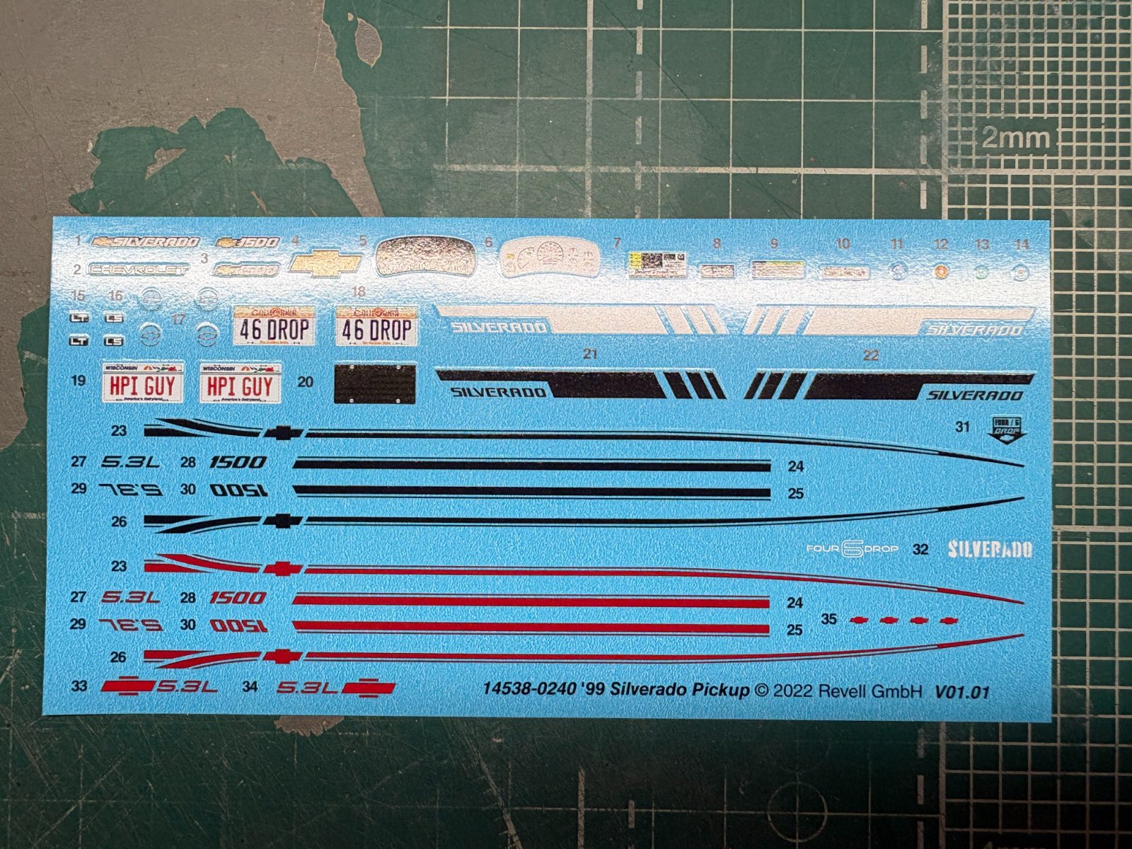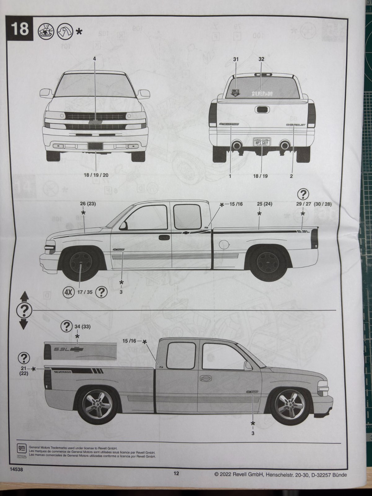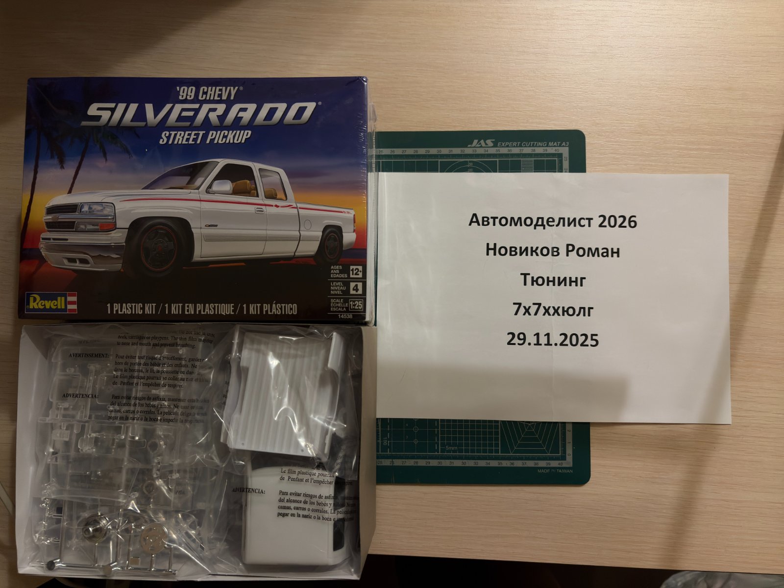 Популярный пост cuba_13 3529 Опубликовано 29 Nov 2025, 09:25:49 Популярный пост Жалоба Поделиться Опубликовано 29 Nov 2025, 09:25:49 Всем добрый день, решил в этом году поучаствовать в конкурсе. Вроде, по времени должен успеть. Строить буду последний выпуск 1999 Silverado от Revell в варианте кастом, который в этом наборе отличается только дисками. Коробка забита литниками под завязку. Если верить информации на коробке - 150 деталей. Начинаем осмотр содержимого коробки. Первым у нас идёт задняя часть. Далее 2 набора резины: сток и кастом. Резина без логотипов. Задние фонари и кабина. Порой, внимание к деталям от Revell очень сильно радует. Стекляшки. В наборе 3 хром литника, половину хрома буду смывать, т.к. Revell с какой-то радости даёт половину деталей движка в хроме. А вот и кастомные диски, которые я буду ставить. Далее идут большие белые литники. Сидушки в наборе, прям огонь, имитация кожи на них очень круто выглядит. Декали. Инструкция. На этом пока всё. Завтра начну обрабатывать детальки и клеить то, что должно быть склеено по покрасочных работ. Спасибо за внимание. 17 Ссылка на сообщение Поделиться на другие сайты