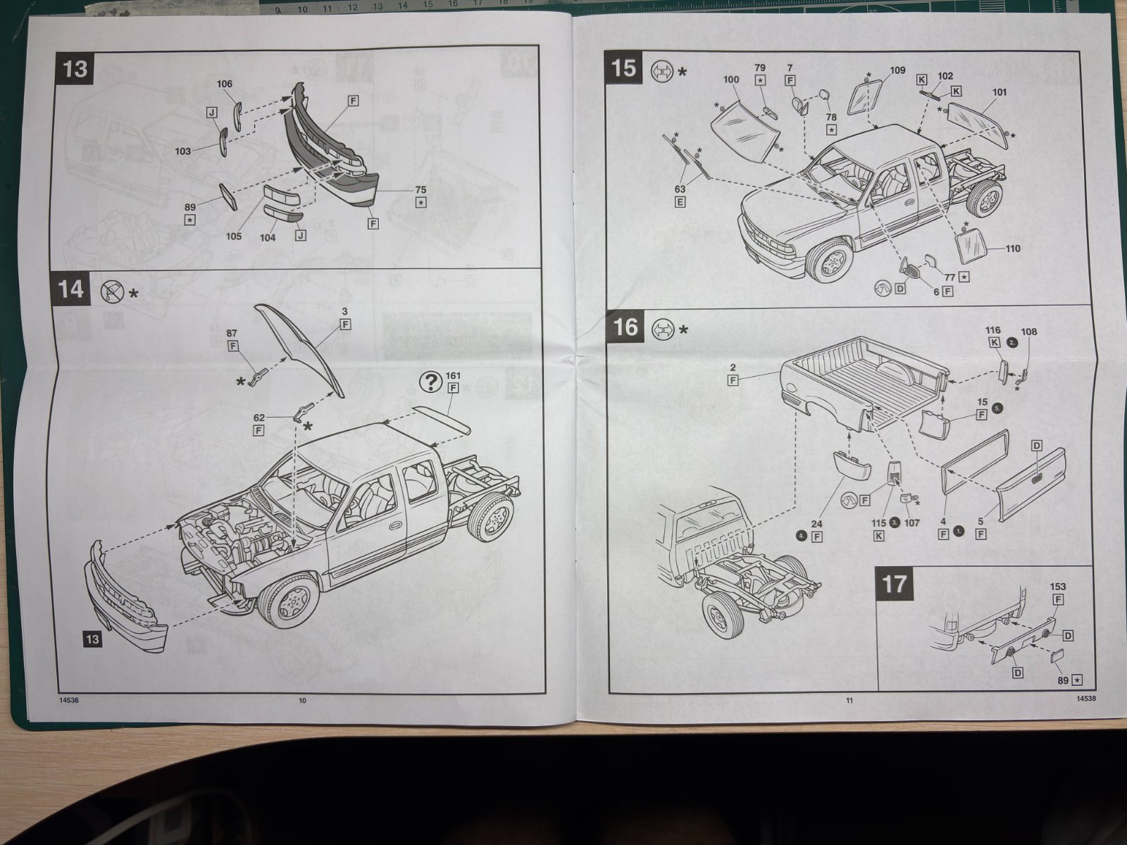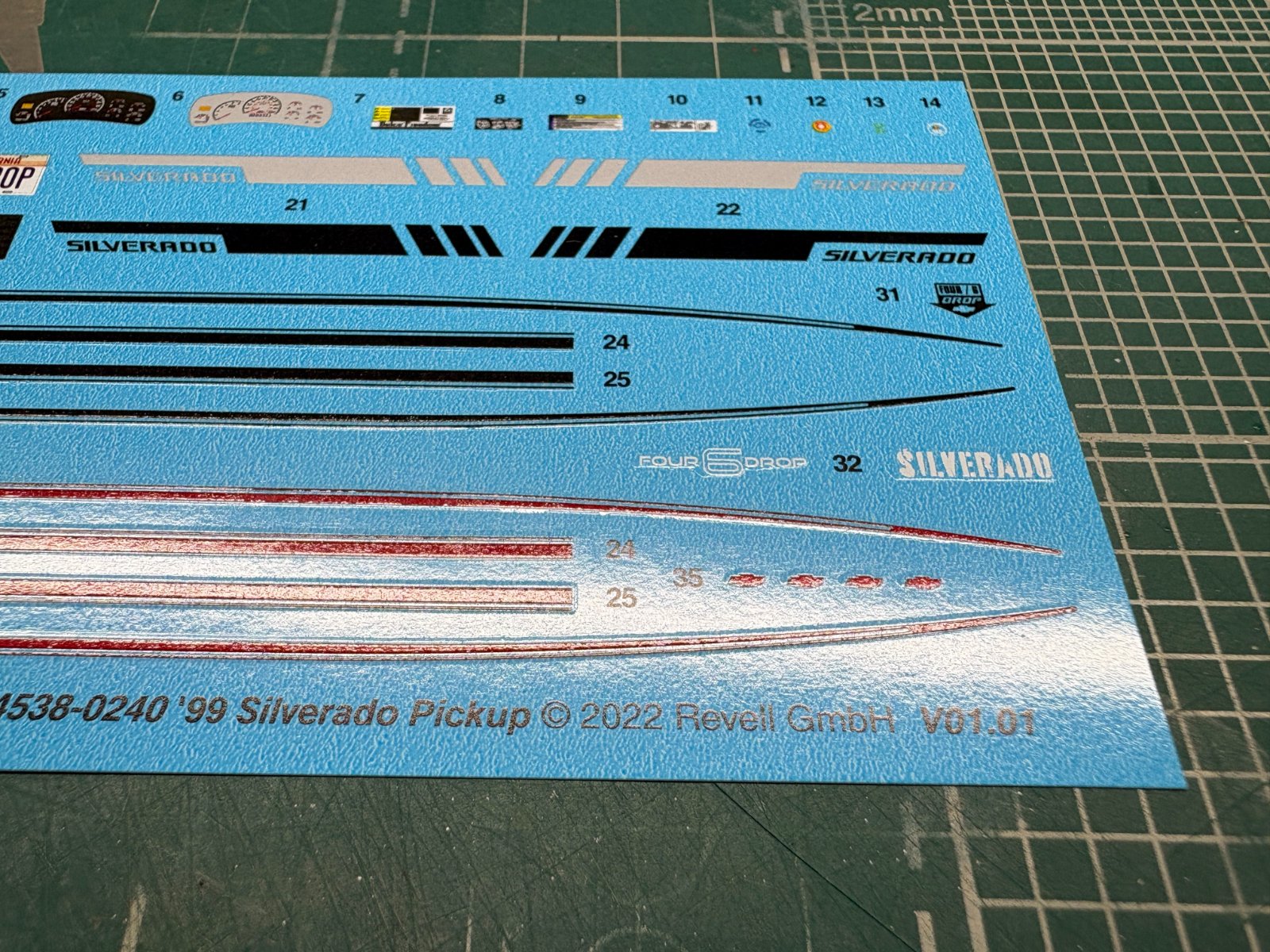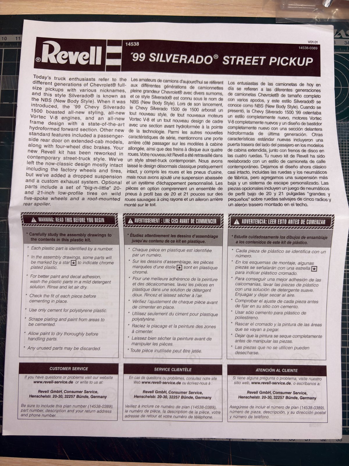 Популярный пост cuba_13 3529 Опубликовано 29 Nov 2025, 09:25:49 Популярный пост Жалоба Поделиться Опубликовано 29 Nov 2025, 09:25:49 Всем добрый день, решил в этом году поучаствовать в конкурсе. Вроде, по времени должен успеть. Строить буду последний выпуск 1999 Silverado от Revell в варианте кастом, который в этом наборе отличается только дисками. Коробка забита литниками под завязку. Если верить информации на коробке - 150 деталей. Начинаем осмотр содержимого коробки. Первым у нас идёт задняя часть. Далее 2 набора резины: сток и кастом. Резина без логотипов. Задние фонари и кабина. Порой, внимание к деталям от Revell очень сильно радует. Стекляшки. В наборе 3 хром литника, половину хрома буду смывать, т.к. Revell с какой-то радости даёт половину деталей движка в хроме. А вот и кастомные диски, которые я буду ставить. Далее идут большие белые литники. Сидушки в наборе, прям огонь, имитация кожи на них очень круто выглядит. Декали. Инструкция. На этом пока всё. Завтра начну обрабатывать детальки и клеить то, что должно быть склеено по покрасочных работ. Спасибо за внимание. 17 Ссылка на сообщение Поделиться на другие сайты