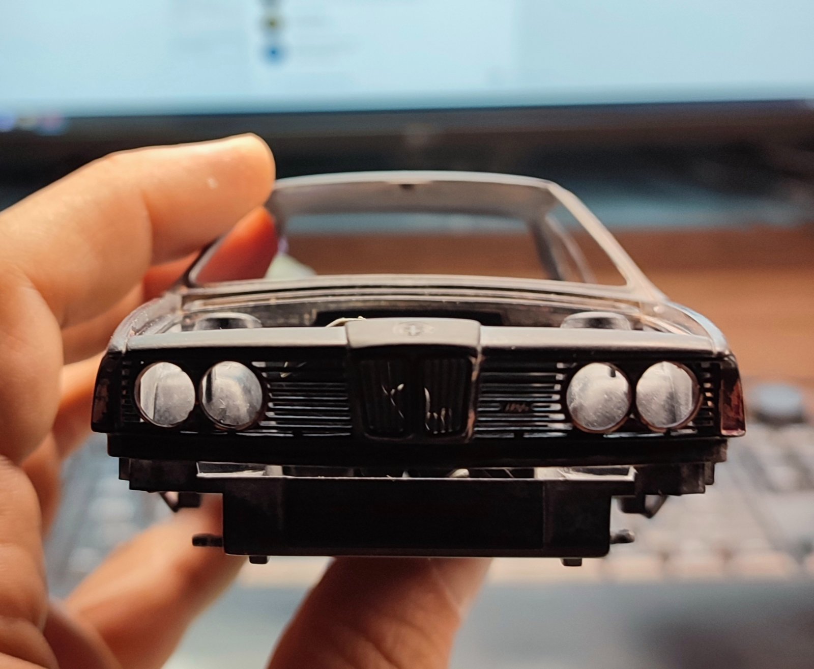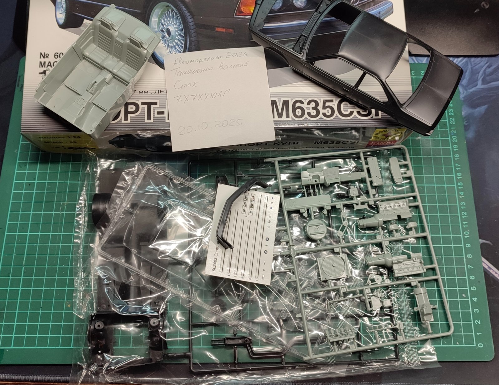 Skalnik 93 Опубликовано сегодня, 03:40:32 Жалоба Поделиться Опубликовано сегодня, 03:40:32 (изменено) Продолжаем засорять форум своими недостроями :) Следующая модель это известная многим коробка от Моделиста. Когда в чате про неё заводишь разговор, то все сразу предлагают её выкинуть/сжечь, что в целом наверное и правильно... Собственно BMW М635CSI от Моделиста, это та же модель 1990го года от Academy, копия модели Tamiya 1986 года, но с упрощениями (под мотор видима). Сравнение инструкций показало отличие только в задней подвески (у Tamiya она есть...). Лучше всех эта модель проработана у Fujimi, опять же, я основываюсь сравнении картинок инструкций. Если бы я именно выбирал производителя сейчас и хотел собрать эту Бэху, то наверняка бы взял Fujimi, но тогда (уже не помню когда) я был не в теме и просто взял коробку за не дорого. Судя по описанию в инструкции у Tamiya, собираем мы модель 1983го года, однако утверждать не могу, различие версий и комплектаций не сравнивал. Собственно решил я заявить эту модель на конкурс Автомоделист2026 и постараться собрать её максимально аккуратно (на сколько руки-крюки позволят). Первое что начал делать это опустил крепление двигателя, а точнее перенёс его с кузова на подрамник. Коллеги сразу предупредили что там нюанс с зазором от движки до капота. Да и у настоящей машины двигатель крепится к подрамнику... Скидал мотор, примеряем: Делаем из 1мм пластика такое же посадочное и вымеряем его положение Срезаем крепление с кузова и примеряем движку еще раз Снизу тоже всё в пределах нормы получается, почти вровень в балкой. Следующим этапом взялся собирать сам двигатель. Изменено сегодня, 03:47:28 пользователем Skalnik 1 Ссылка на сообщение Поделиться на другие сайты