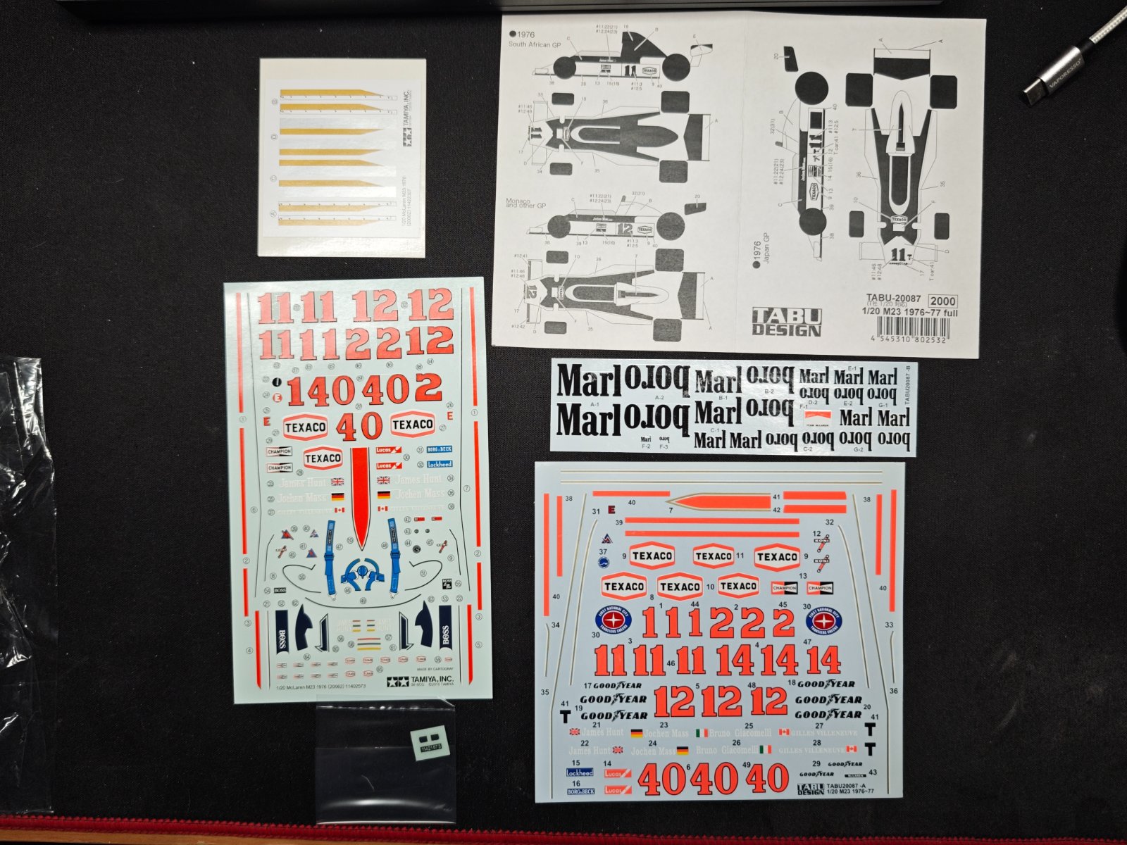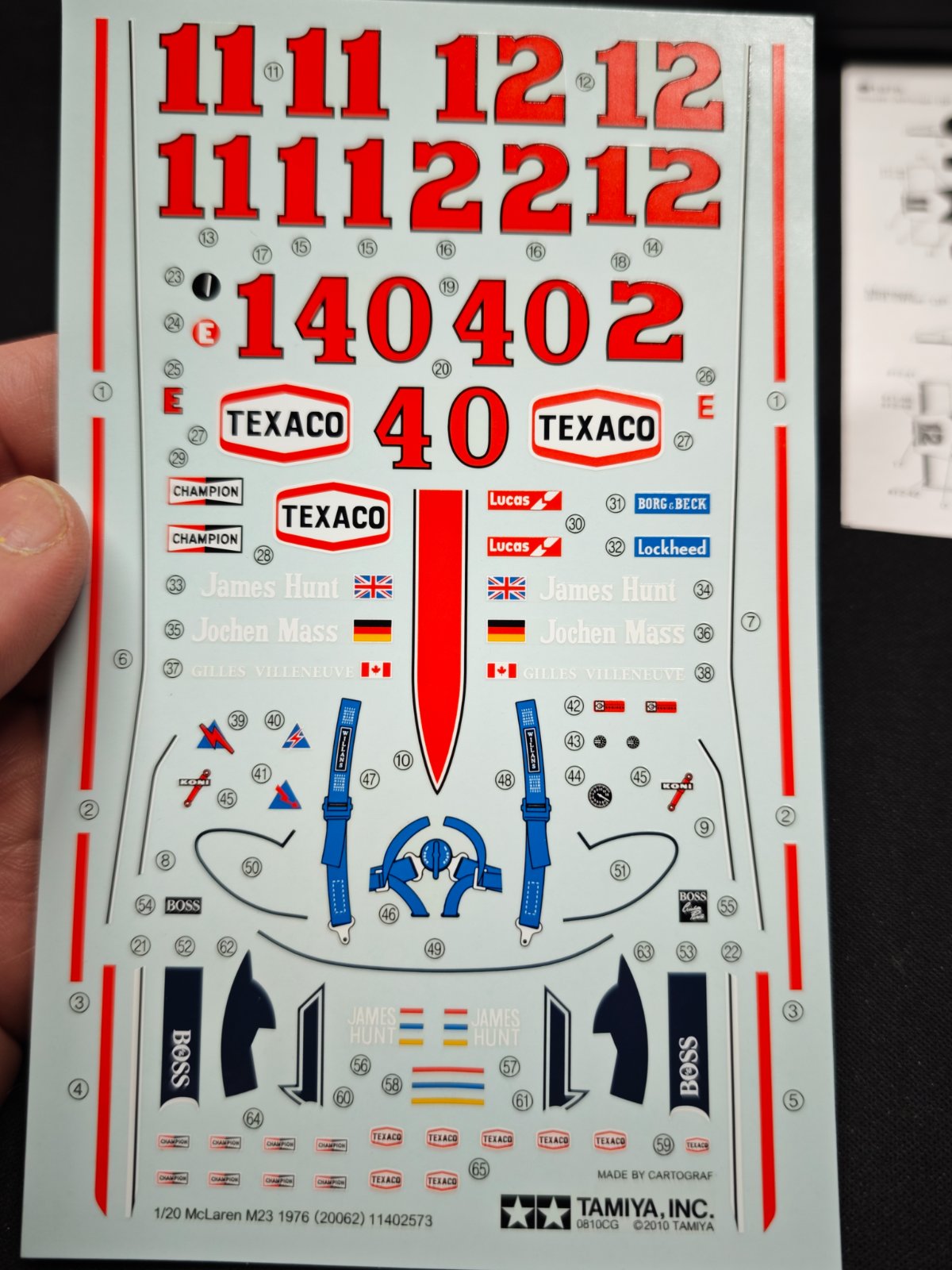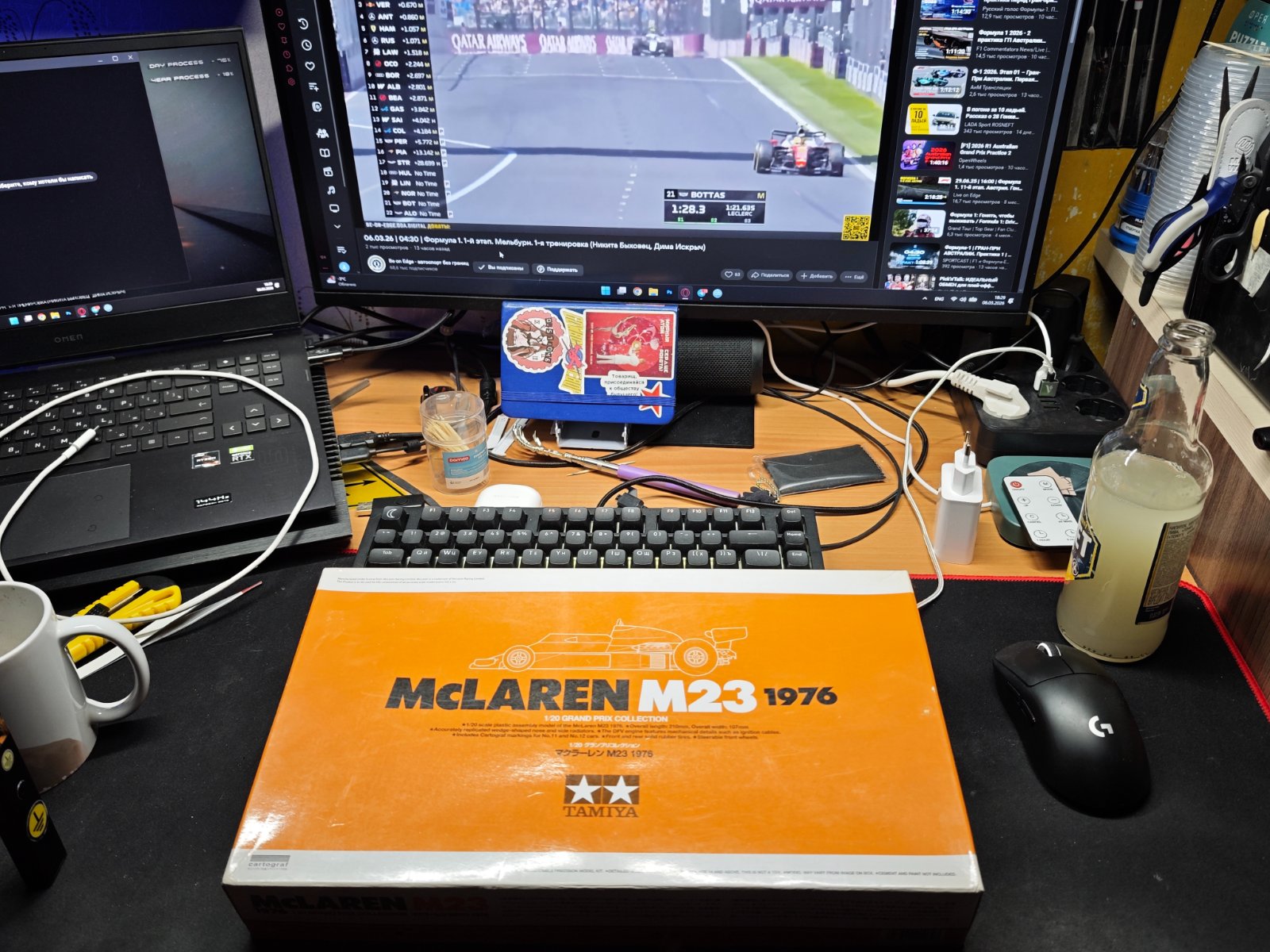 Terranova 127 Опубликовано сегодня, 13:38:54 Жалоба Поделиться Опубликовано сегодня, 13:38:54 (изменено) После завершения Ferrari 312T2 Ники Лауды, недолго думая вскрываю коробку с McLaren M23, на котором его заклятый друг и соперник в 1976м году завоевал титул, обойдя Ники на одно очко по итогам сезона. McLaren M23 - болид разработанный под руководством Гордона Коппака с участием Джона Барнарда. При разработке они своровали вдохновлялись Lotus 72, от которого были переняты основные формы кузова и компоновка шасси. М23 принёс команде McLaren один кубок конструкторов (1974г) и два титула в личном зачёте (Эмерсон Фиттипальди в 1974м и Джеймс Хант в 1976м). Шасси М23 дорабатываясь и модернизируясь использовалось с 1973 по 1978 года. Lotus 72D Эмерсон Фиттипальди, 1972г. McLaren M23 Денни Халма 1973го года McLaren M23, Джеймс Хант, Япония, трасса Фудзи. 1976г. McLaren M26, Джеймс Хант. Великобритания, трасса Брендс Хетч. 1978г. 1978 год. McLaren M26. Фейспалм в исполнении Джеймса Ханта. Видимо, он не сильно рад экспериментам с аэродинамикой своих инженеров) Двигатель - Ford Cosworth DFV V8 Пока искал фотографии выше, наткнулся на пинтересте на множество очень странных болидов, оставлю их под спойлером на память) Спойлер Содержимое коробки Стандартный тамиевский литник с DFV. Стыков от прессформ придётся много зачищать, но это я уже проходил. Литник с подвеской, радиаторами, дисками и прочим по мелочи. Хромированные детали. Хром буду смывать и зачицать от облоя. Обтекатеть и антикрылья. На днище имеется отверстие толи под моторчик, толи под батарейку. Ни разу не видел сборок с ними. Если кому-то встречалась реализация этой фичи, то буду очень благодарен за ссылочку для посмотреть) Стекляшка. На ней есть страшный вырез под крепление зеркала. Лист с декалями. Есть фамилии и номера не толька Джеймса Ханта и Йохана Масса на сезон 1976го года, но и Жиля Вильнёва, который дебютировал за рулём М23 в 1977 году. Из допов буду использовать тамиевское фототравление и декали от Tabu Начал с попытки осознать, сколько мне предстоит шкурить и шпаклевать На носу и переднем антикрыле имеются утяжины. Нос отпиливать не буду, просто нарежу в том месте расшивку. Сбоку утяжины, ненужные швы и верхняя с нижней половины обтекателя стыкуются нелучшим образом. Торцевые пластины переднего антикрыла буду менять на травлёные. Воздухозаборник двигателя собирается из двух частей, этот шов тоже буду затирать. По хорошему, надо будет выпилить горизонтальную перемычку внутри него. Рычаги передней подвески выглядят грустно. Попробую как-нибудь подпилить. Изменено сегодня, 14:48:33 пользователем Terranova 3 Ссылка на сообщение Поделиться на другие сайты