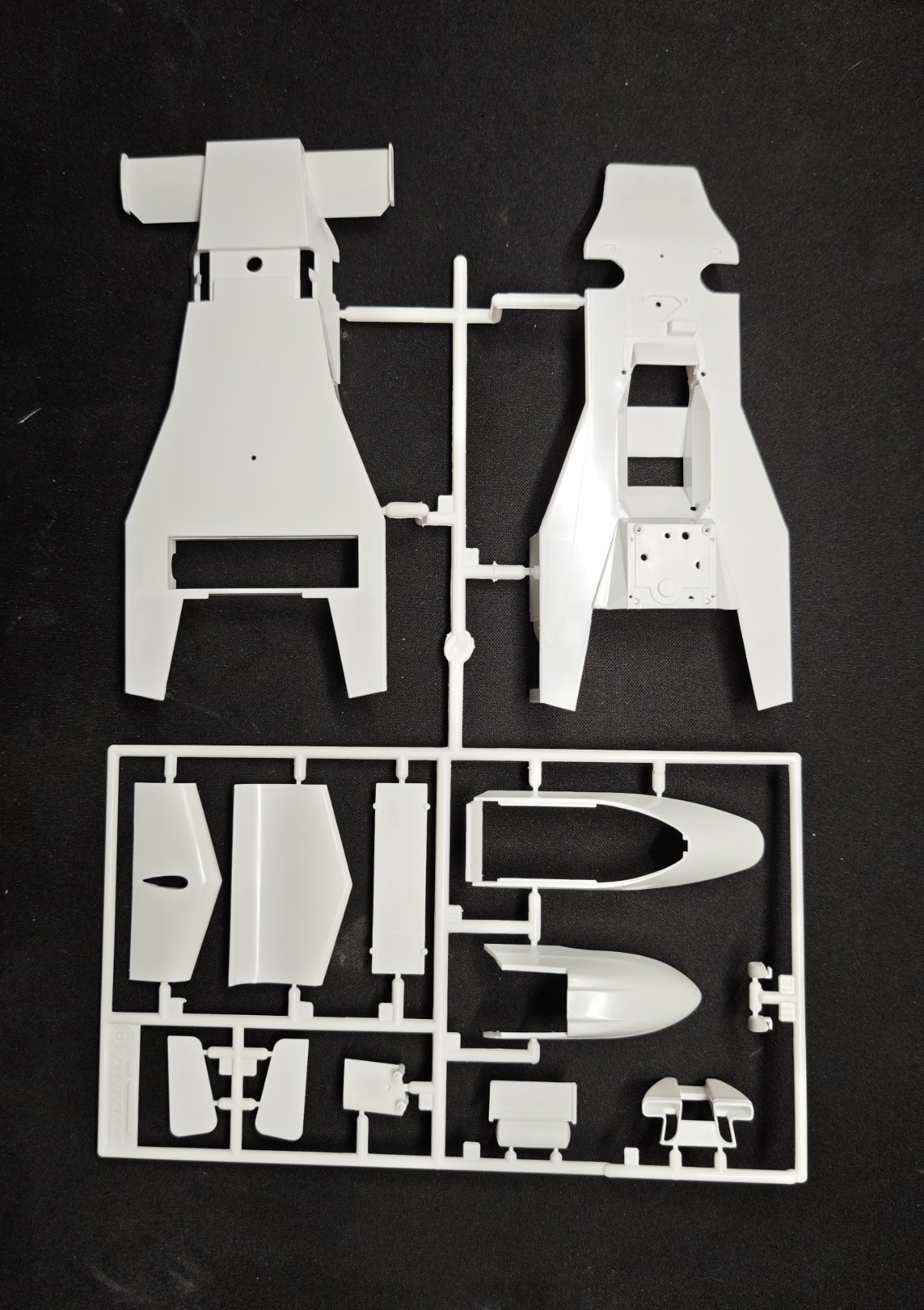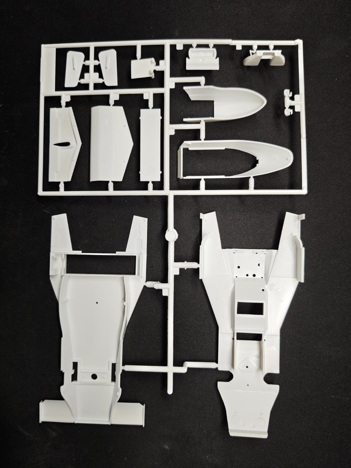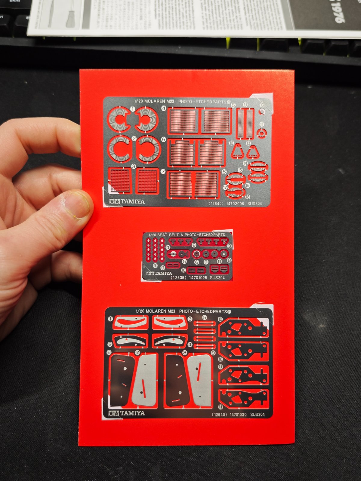 Terranova 127 Опубликовано сегодня, 13:38:54 Жалоба Поделиться Опубликовано сегодня, 13:38:54 (изменено) После завершения Ferrari 312T2 Ники Лауды, недолго думая вскрываю коробку с McLaren M23, на котором его заклятый друг и соперник в 1976м году завоевал титул, обойдя Ники на одно очко по итогам сезона. McLaren M23 - болид разработанный под руководством Гордона Коппака с участием Джона Барнарда. При разработке они своровали вдохновлялись Lotus 72, от которого были переняты основные формы кузова и компоновка шасси. М23 принёс команде McLaren один кубок конструкторов (1974г) и два титула в личном зачёте (Эмерсон Фиттипальди в 1974м и Джеймс Хант в 1976м). Шасси М23 дорабатываясь и модернизируясь использовалось с 1973 по 1978 года. Lotus 72D Эмерсон Фиттипальди, 1972г. McLaren M23 Денни Халма 1973го года McLaren M23, Джеймс Хант, Япония, трасса Фудзи. 1976г. McLaren M26, Джеймс Хант. Великобритания, трасса Брендс Хетч. 1978г. 1978 год. McLaren M26. Фейспалм в исполнении Джеймса Ханта. Видимо, он не сильно рад экспериментам с аэродинамикой своих инженеров) Двигатель - Ford Cosworth DFV V8 Пока искал фотографии выше, наткнулся на пинтересте на множество очень странных болидов, оставлю их под спойлером на память) Спойлер Содержимое коробки Стандартный тамиевский литник с DFV. Стыков от прессформ придётся много зачищать, но это я уже проходил. Литник с подвеской, радиаторами, дисками и прочим по мелочи. Хромированные детали. Хром буду смывать и зачицать от облоя. Обтекатеть и антикрылья. На днище имеется отверстие толи под моторчик, толи под батарейку. Ни разу не видел сборок с ними. Если кому-то встречалась реализация этой фичи, то буду очень благодарен за ссылочку для посмотреть) Стекляшка. На ней есть страшный вырез под крепление зеркала. Лист с декалями. Есть фамилии и номера не толька Джеймса Ханта и Йохана Масса на сезон 1976го года, но и Жиля Вильнёва, который дебютировал за рулём М23 в 1977 году. Из допов буду использовать тамиевское фототравление и декали от Tabu Начал с попытки осознать, сколько мне предстоит шкурить и шпаклевать На носу и переднем антикрыле имеются утяжины. Нос отпиливать не буду, просто нарежу в том месте расшивку. Сбоку утяжины, ненужные швы и верхняя с нижней половины обтекателя стыкуются нелучшим образом. Торцевые пластины переднего антикрыла буду менять на травлёные. Воздухозаборник двигателя собирается из двух частей, этот шов тоже буду затирать. По хорошему, надо будет выпилить горизонтальную перемычку внутри него. Рычаги передней подвески выглядят грустно. Попробую как-нибудь подпилить. Изменено сегодня, 14:48:33 пользователем Terranova 3 Ссылка на сообщение Поделиться на другие сайты