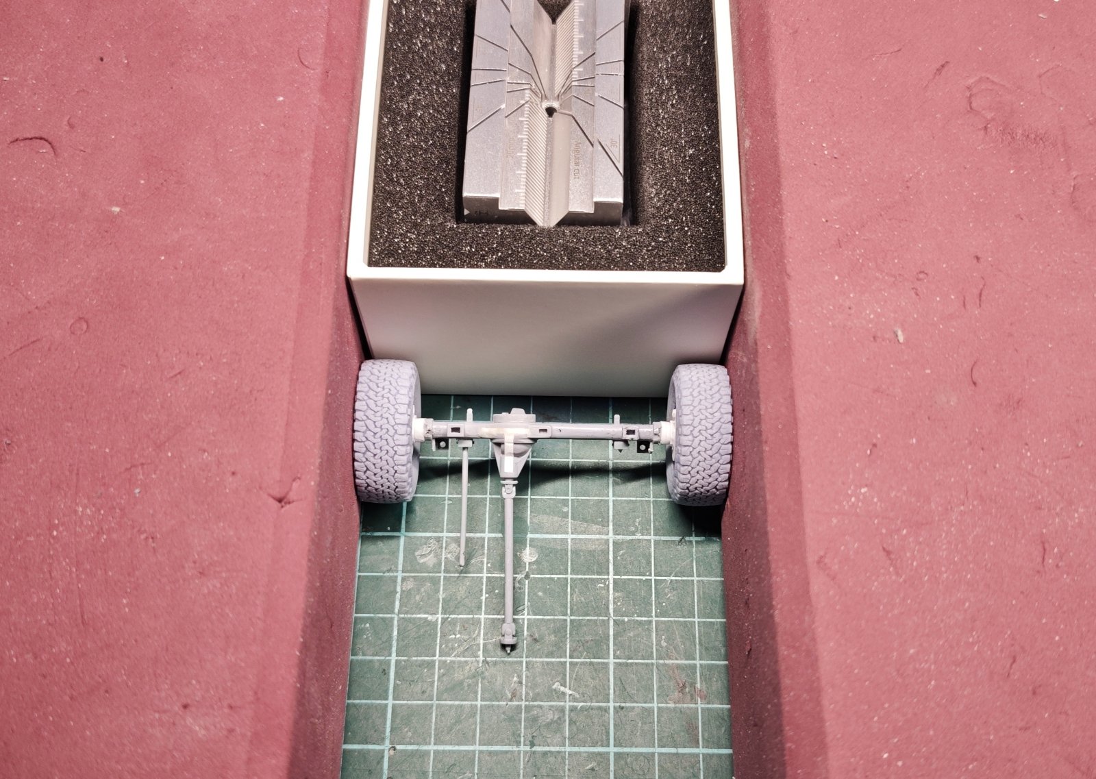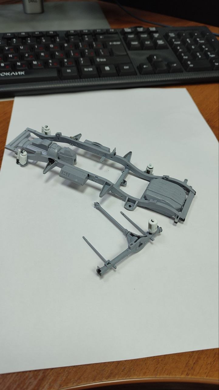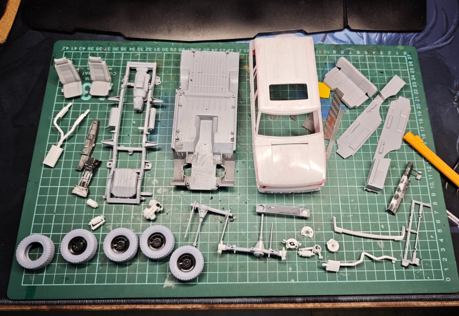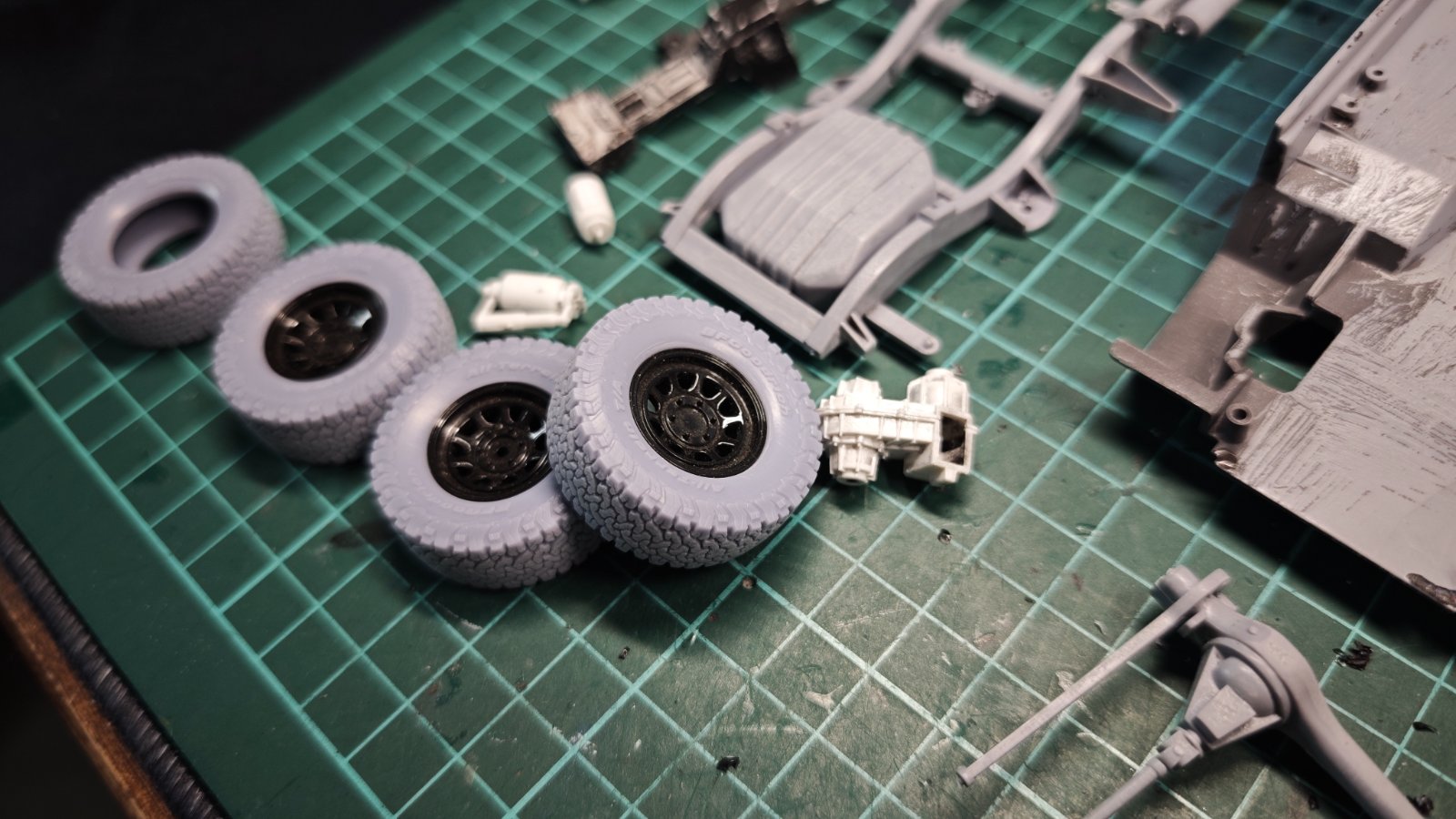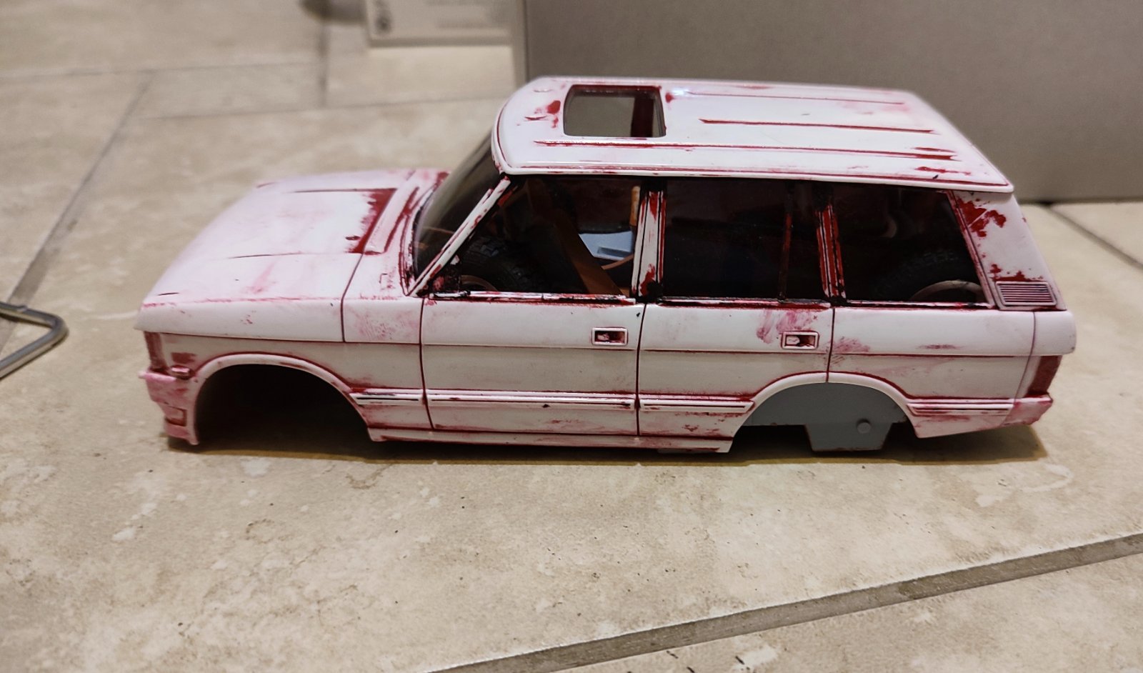 Skalnik 307 Опубликовано сегодня, 04:06:56 Жалоба Поделиться Опубликовано сегодня, 04:06:56 (изменено) Ну что, закончил сливу, надо бы закончить остальные, но... Начну еще один долгий ВИП, на этот раз по восстановлению модели Land Rover LH36D Range Rover Classic `92 от Aoshima (у меня очень много подобных полутрупов, не спрашивайте зачем :) ). Строить буду долго, т.к. много пилить, а приоритет надо всё же отдать M635 CSI и HCR32. Первый пост будет ознакомительно-планировочный, постараюсь в одном месте изложить план действия (для себя), возможно даже буду его потом соблюдать :) Значит достался он мне уже частично отмытый и не полностью разобран. Ходовка была окрашена и склеена суперклеем, местами криво. В ходе отмывки мелкие места конечно отломались, будем восстанавливать. Набор у меня лежит в закромах более года, что-то ковырял уже, на сегодняшний день он выглядит так (что-то еще в коробке/пакете валяется) Цвет планируется песочно-желтый. Из допов будет запаска, багажник на крышу, какой-то шмурдяк, расширители на кузов, возможно передний бампер из труб... По салону наверное сток будет. Как прообраз для постройки будут использоваться вот эти фотки: Штатные мелкие не красивые колеса будут заменены на Аошимовские 16" тазики Dytona AWC Steel, а резину я напечатал еще осенью под этот проект, размером 34мм, что примерно равно 32" в реальности. В целом это не большое увеличение относительно стоковых 29", так называемый, гражданский лифт. На фотках же у образцов как будто 33-35". В процессе еще посмотрю, может закажу по толще колеса. Муляж двигателя довольно страшный, а я сусликов люблю... Первая мысль - надо чем-то заменить. Интернет сказал, что ранние V8 у Ведровера, это лицензионный движок от General Motors (Buick 215 1961года). Взял для примерки двигатель от Сamaro Revell, но в 25м масштабе, мелковат как будто И вот в процессе обсуждения идеи с @vova26003 он мне напомнил про ходовку от GMC в моих запасах. Он как раз оказался в 24м масштабе, и движок по габаритам как раз как муляж у Аошимы. Конечно это не тот же двигатель, но как отправная точка для суслика - пойдёт. Немного поправлю поддон, перенесу фильтр вперёд, для похожести, может поправилю выпускные коллектора. Капот не хочу открывать, слишком много доработок это потянет за собой. Какие-то работы по набору начинались давно. Например на мостах сверху и на пневмоподушках были отверстия от литья, я их решил закрыть, т.к. планируется чуть лифтануть машину и есть шанс, что их будет видно. Вклеил пластик, срезал, шлифанул. Раму дочистил от клея, ужаснулся количеству утяжин с внутренней стороны. Замазал их шпатлей, позже шлифану. Самая беда с ходовкой - поворотные кулаки на переднем мосту были насмерть залиты супер клеем. Несколько дней в ИПСе не помогли, частично расколупал, но без потерь обойтись не удалось... В общем буду делать заново, скорее всего не на шаре, как было по инструкции, а на шкворнях. Поэтому начал с простого, с заднего моста. Примерил расширители, определился с общей шириной, начал собирать в кучу мост, тормоза и новые колёса. По ширине всё почти сошлось, но получился вид, как будто на ступицу прикрутили проставки +150мм, колёса сильно торчат, а тормозные диски оказались за границами этих самых колёс :) Решил пилить тормоза (у них был сильный вылет посадочной плоскости), диски же под Аошимовский стандарт, с поликапами в них. Самое простое было бы срезать выступ в дисках и прости приклеить