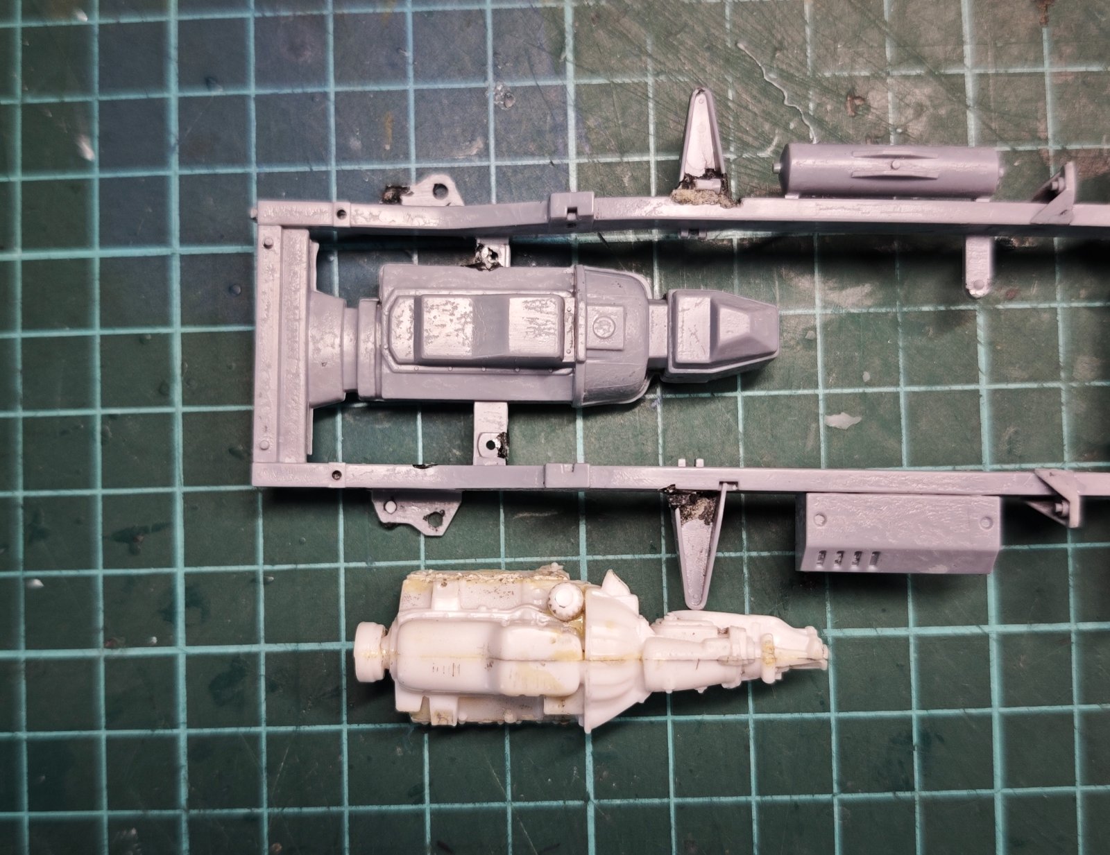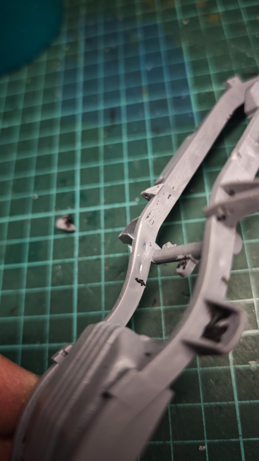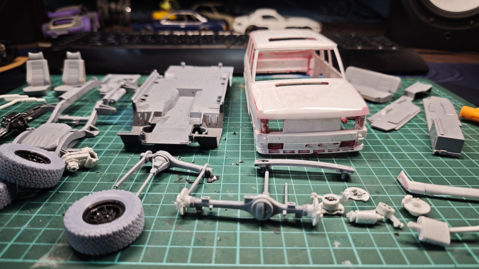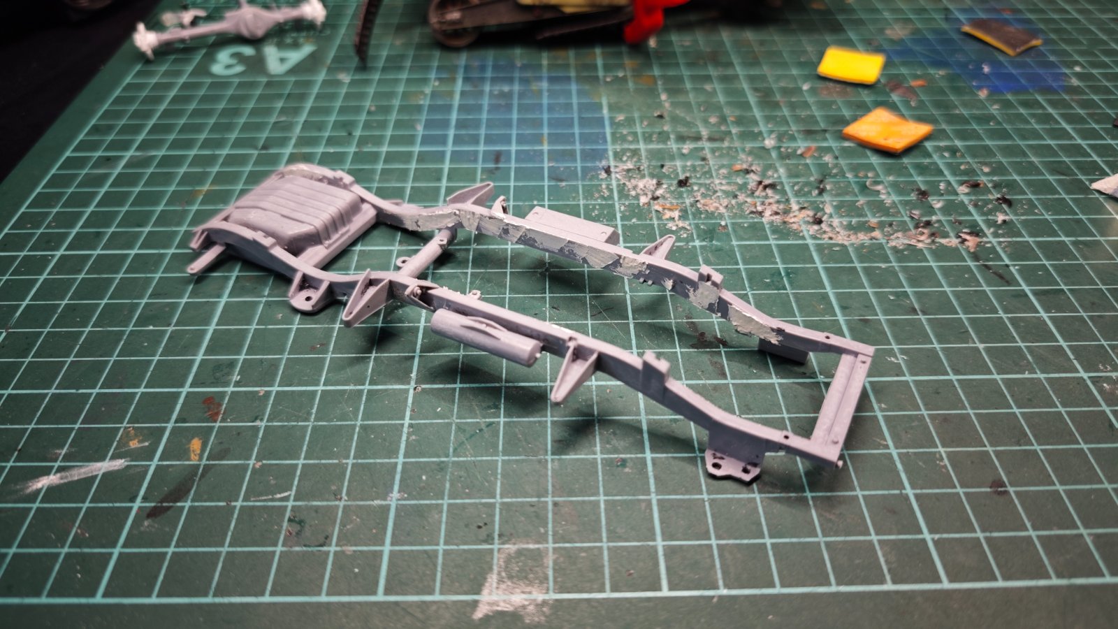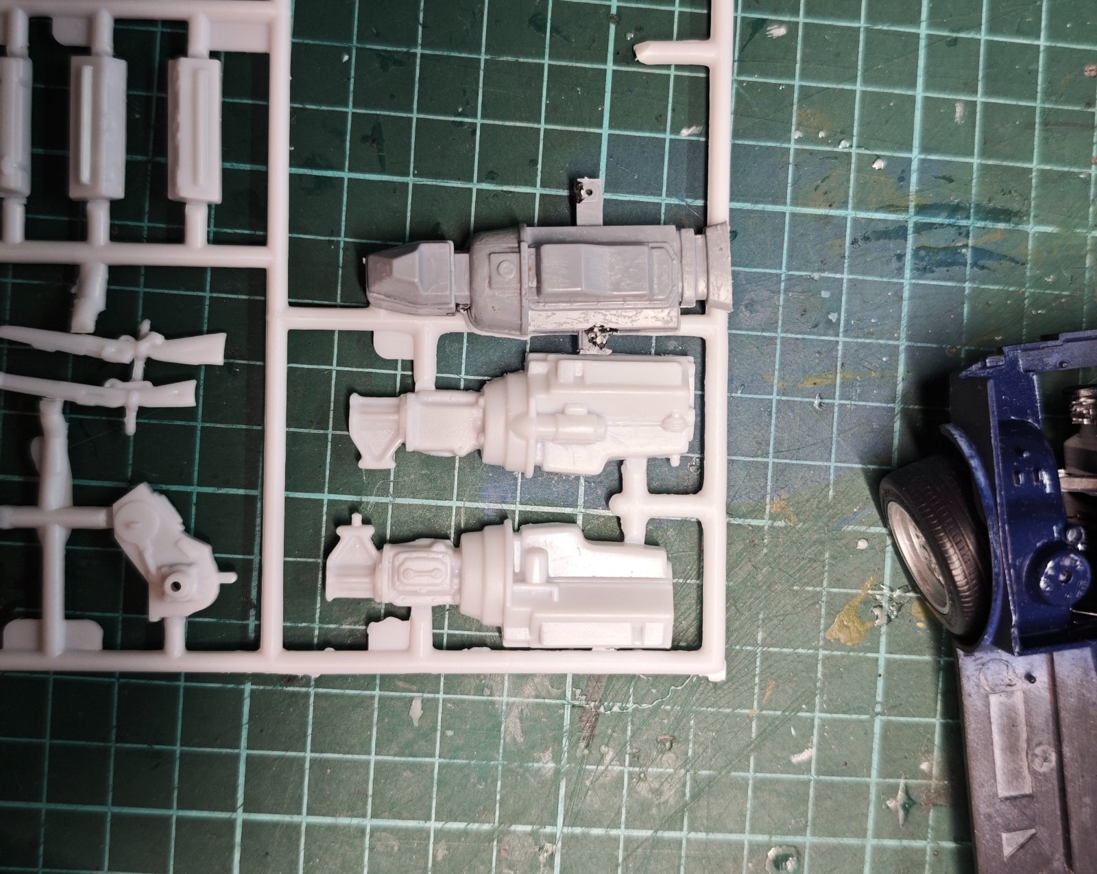 Skalnik 307 Опубликовано сегодня, 04:06:56 Жалоба Поделиться Опубликовано сегодня, 04:06:56 (изменено) Ну что, закончил сливу, надо бы закончить остальные, но... Начну еще один долгий ВИП, на этот раз по восстановлению модели Land Rover LH36D Range Rover Classic `92 от Aoshima (у меня очень много подобных полутрупов, не спрашивайте зачем :) ). Строить буду долго, т.к. много пилить, а приоритет надо всё же отдать M635 CSI и HCR32. Первый пост будет ознакомительно-планировочный, постараюсь в одном месте изложить план действия (для себя), возможно даже буду его потом соблюдать :) Значит достался он мне уже частично отмытый и не полностью разобран. Ходовка была окрашена и склеена суперклеем, местами криво. В ходе отмывки мелкие места конечно отломались, будем восстанавливать. Набор у меня лежит в закромах более года, что-то ковырял уже, на сегодняшний день он выглядит так (что-то еще в коробке/пакете валяется) Цвет планируется песочно-желтый. Из допов будет запаска, багажник на крышу, какой-то шмурдяк, расширители на кузов, возможно передний бампер из труб... По салону наверное сток будет. Как прообраз для постройки будут использоваться вот эти фотки: Штатные мелкие не красивые колеса будут заменены на Аошимовские 16" тазики Dytona AWC Steel, а резину я напечатал еще осенью под этот проект, размером 34мм, что примерно равно 32" в реальности. В целом это не большое увеличение относительно стоковых 29", так называемый, гражданский лифт. На фотках же у образцов как будто 33-35". В процессе еще посмотрю, может закажу по толще колеса. Муляж двигателя довольно страшный, а я сусликов люблю... Первая мысль - надо чем-то заменить. Интернет сказал, что ранние V8 у Ведровера, это лицензионный движок от General Motors (Buick 215 1961года). Взял для примерки двигатель от Сamaro Revell, но в 25м масштабе, мелковат как будто И вот в процессе обсуждения идеи с @vova26003 он мне напомнил про ходовку от GMC в моих запасах. Он как раз оказался в 24м масштабе, и движок по габаритам как раз как муляж у Аошимы. Конечно это не тот же двигатель, но как отправная точка для суслика - пойдёт. Немного поправлю поддон, перенесу фильтр вперёд, для похожести, может поправилю выпускные коллектора. Капот не хочу открывать, слишком много доработок это потянет за собой. Какие-то работы по набору начинались давно. Например на мостах сверху и на пневмоподушках были отверстия от литья, я их решил закрыть, т.к. планируется чуть лифтануть машину и есть шанс, что их будет видно. Вклеил пластик, срезал, шлифанул. Раму дочистил от клея, ужаснулся количеству утяжин с внутренней стороны. Замазал их шпатлей, позже шлифану. Самая беда с ходовкой - поворотные кулаки на переднем мосту были насмерть залиты супер клеем. Несколько дней в ИПСе не помогли, частично расколупал, но без потерь обойтись не удалось... В общем буду делать заново, скорее всего не на шаре, как было по инструкции, а на шкворнях. Поэтому начал с простого, с заднего моста. Примерил расширители, определился с общей шириной, начал собирать в кучу мост, тормоза и новые колёса. По ширине всё почти сошлось, но получился вид, как будто на ступицу прикрутили проставки +150мм, колёса сильно торчат, а тормозные диски оказались за границами этих самых колёс :) Решил пилить тормоза (у них был сильный вылет посадочной плоскости), диски же под Аошимовский стандарт, с поликапами в них. Самое простое было бы срезать выступ в дисках и прости приклеить